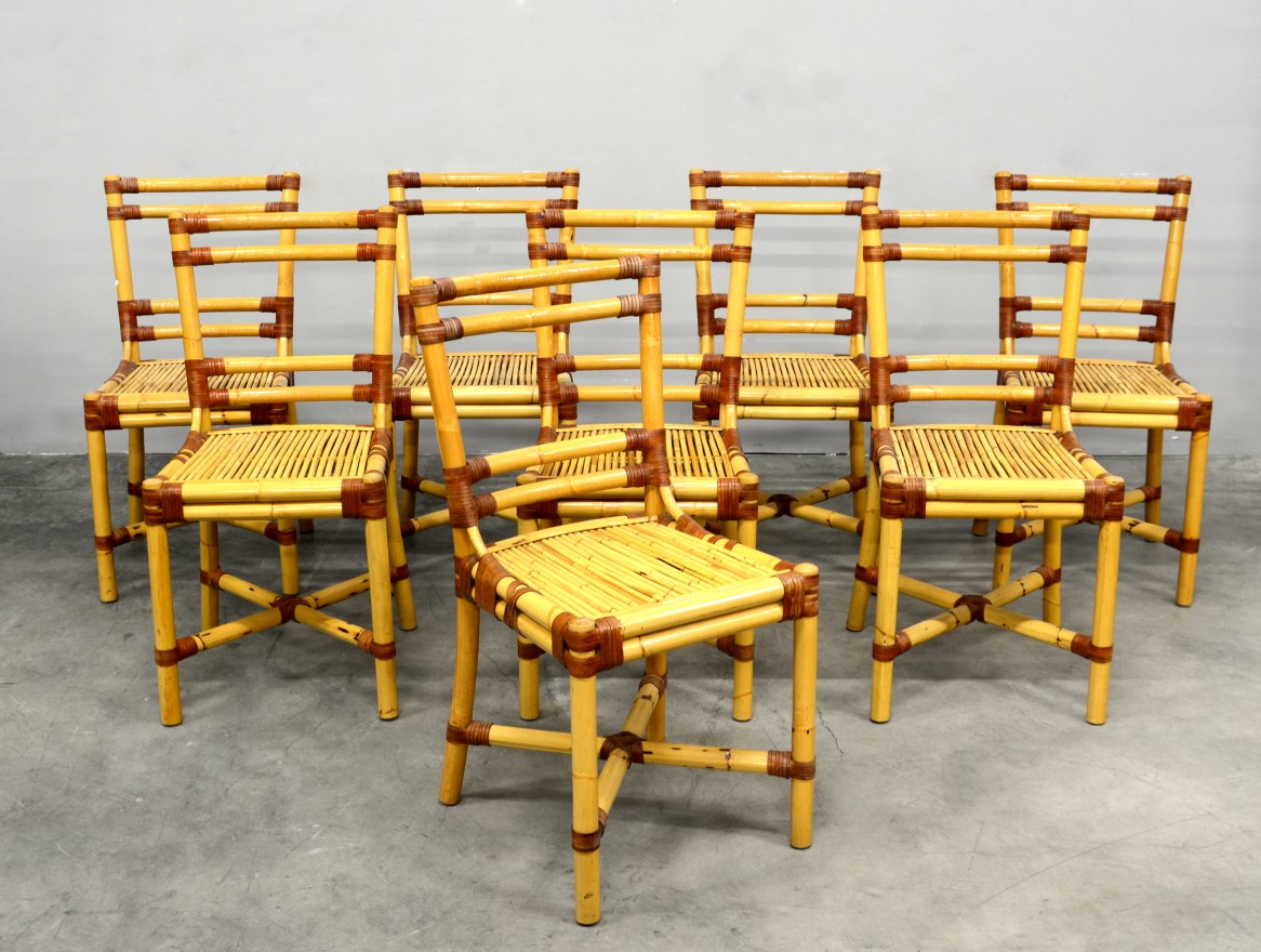 Gruppo di otto sedie in malacca e cuoio. Sec XX (lievi difetti)
