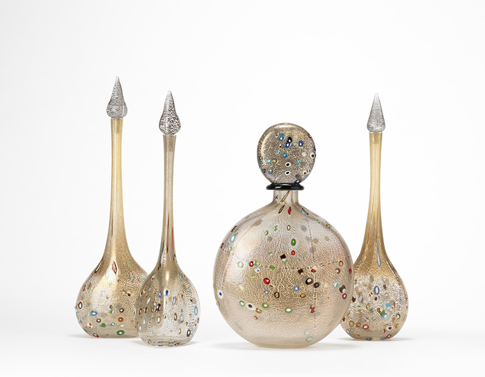 Luigi Mellara Lotto di quattro bottiglie a murrine con applicazione di foglia d'oro. Complete di tappi. Manifattura di Murano, seconda met‡ del sec XX. Firmate a punta sotto la base (misure diverse) (difetti a un tappo)