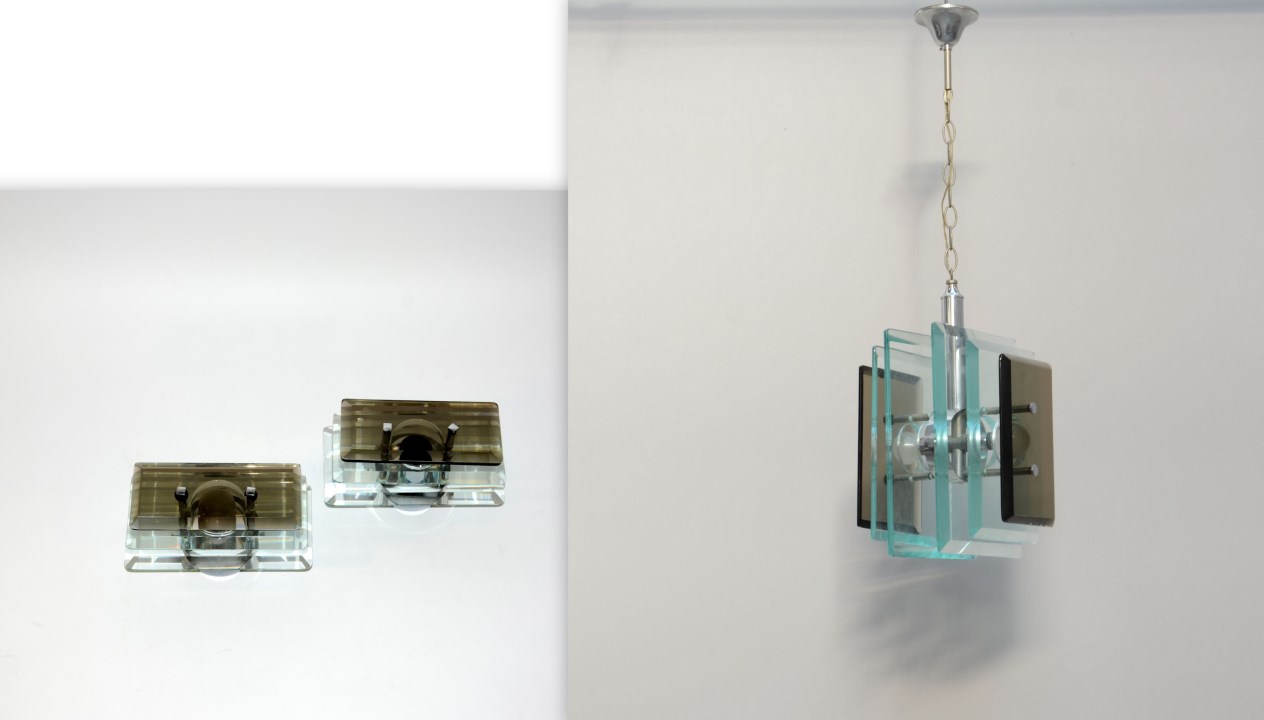 ) Lampada a sospensione e due applique con struttura in metallo cromato e setti diffusori in vetro molato verdino e fumË. Italia anni 70 (misure diverse) (lievi difetti)