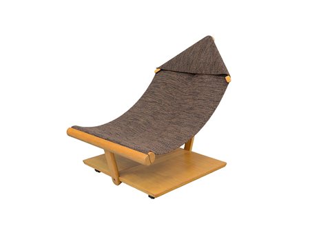 Gigi Sabadin Poltrona modello "Sdraio". Produzione Sabadin, Verona 1974. Legno di frassino e tessuto marrone (cm 86x103x113) (lievi difetti) Bibliografia: G. Gramigna, Repertorio del design italiano 1950-2000 per l'arredamento domestico, Allemandi, Torino 2003, p. 271