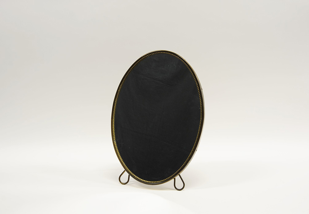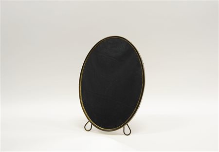 Specchio da tavolo ovale con cornice e struttura in ottone. Italia sec XX (h cm 42,5) (lievi difetti)