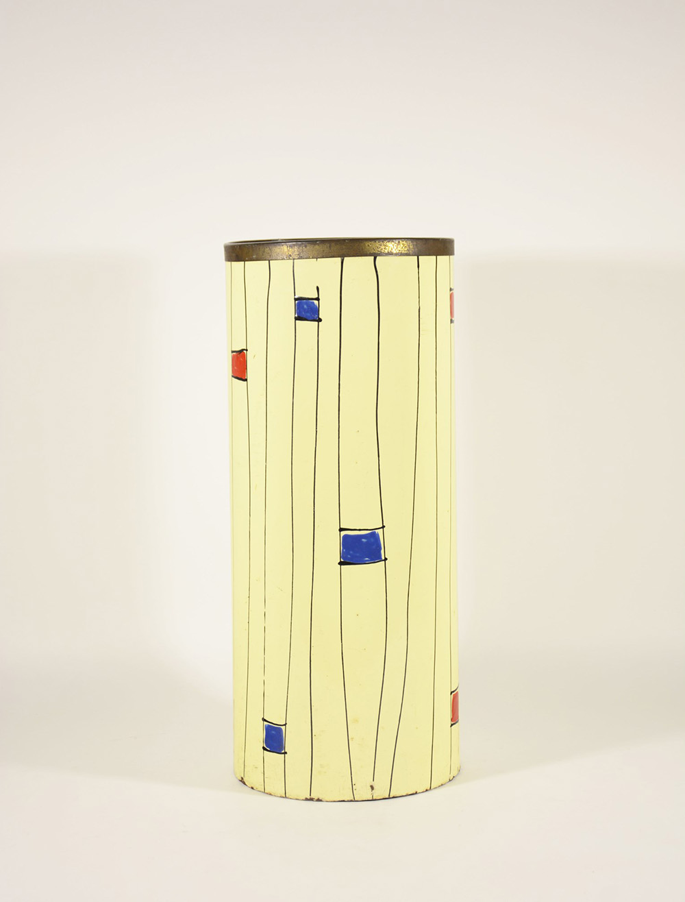 Portaombrelli cilindrico smaltato in color crema con decori in nero, rosso e blu. Italia, fine anni 60 (h cm 49) (difetti)