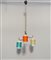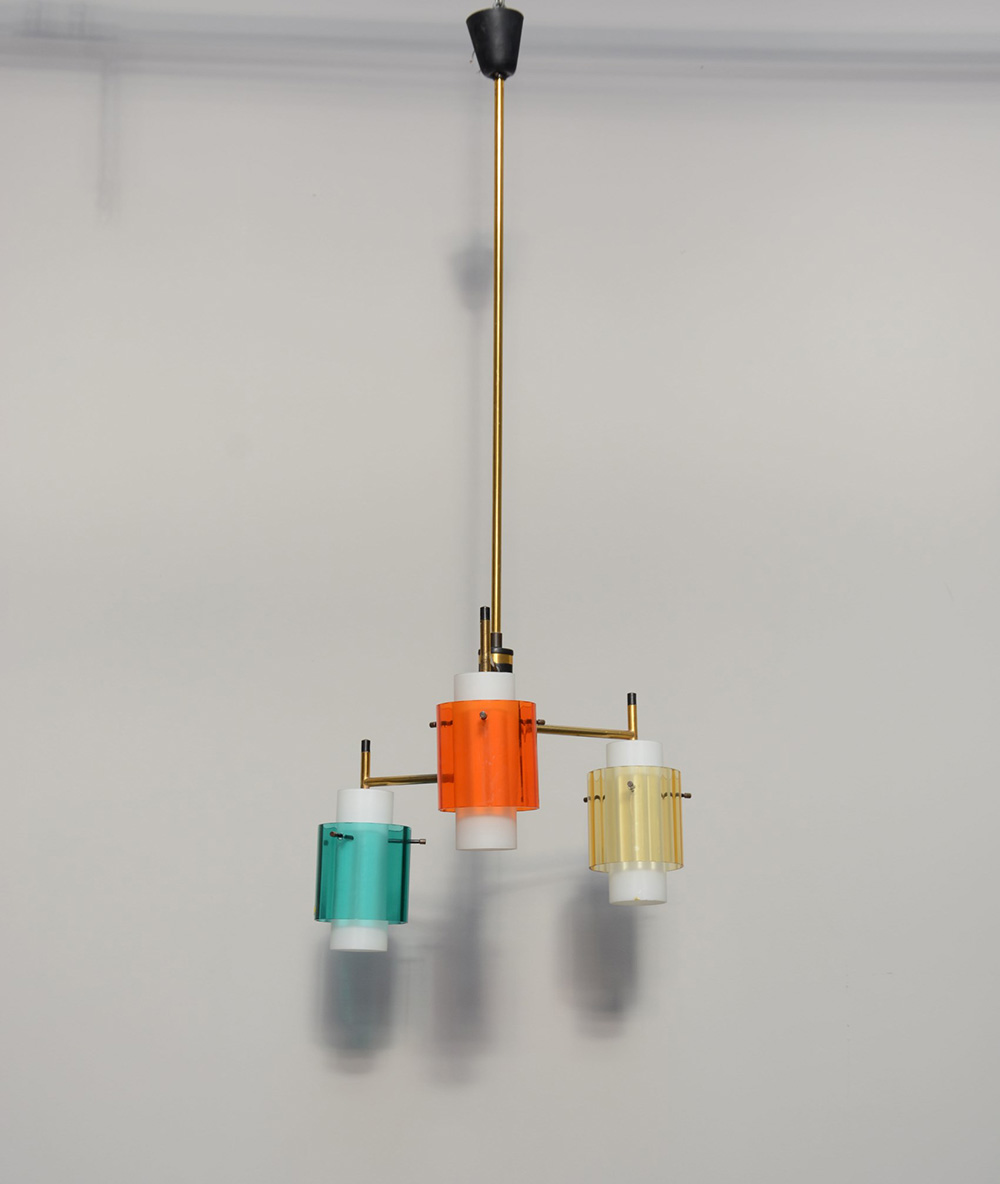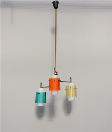 Lampadario in ottone e metallo laccato nero a tre luci con paralumi in vetro arancio, verde e giallo. Italia, fine anni 60 (h cm 100) (lievi difetti)
