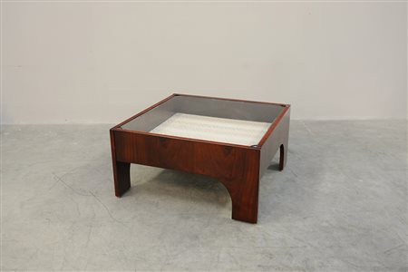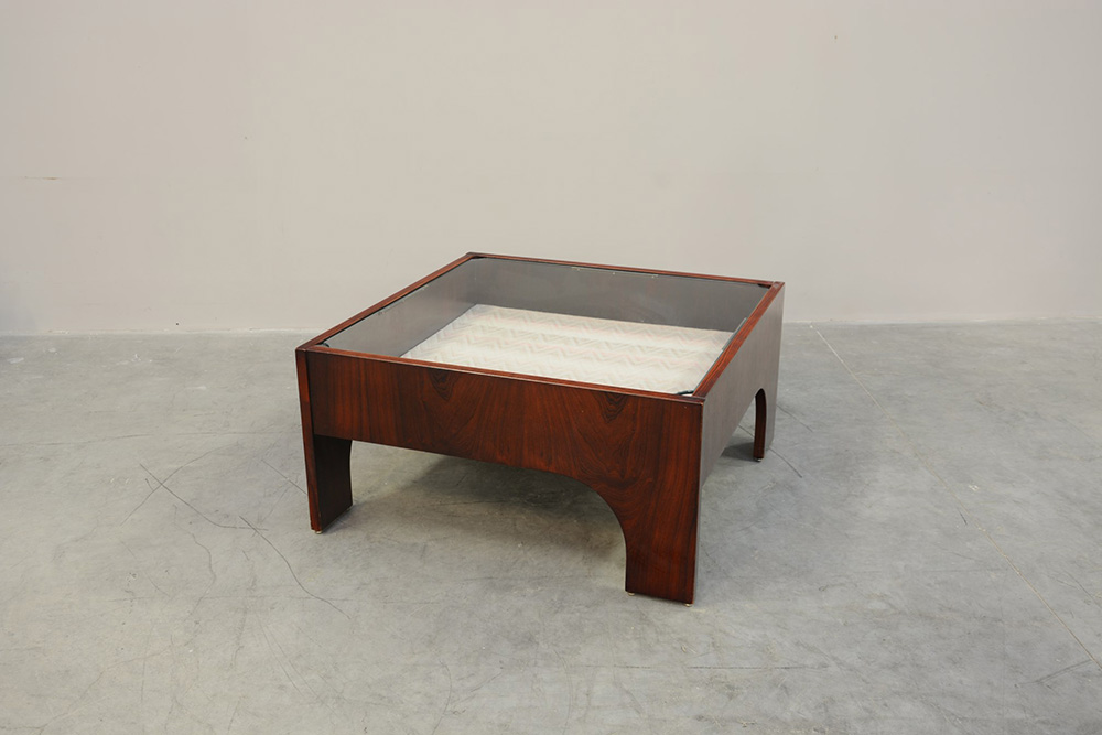 Claudio Salocchi (1934- ) Tavolino della serie "Oriolo". Produzione Sormani, Arosio, fine anni 60. Struttura impiallacciata in palissandro indiano, piano in vetro (cm 83x42x83) (difetti) Bibliografia: "Domus", n. 410, gennaio 1964, p. 189