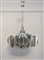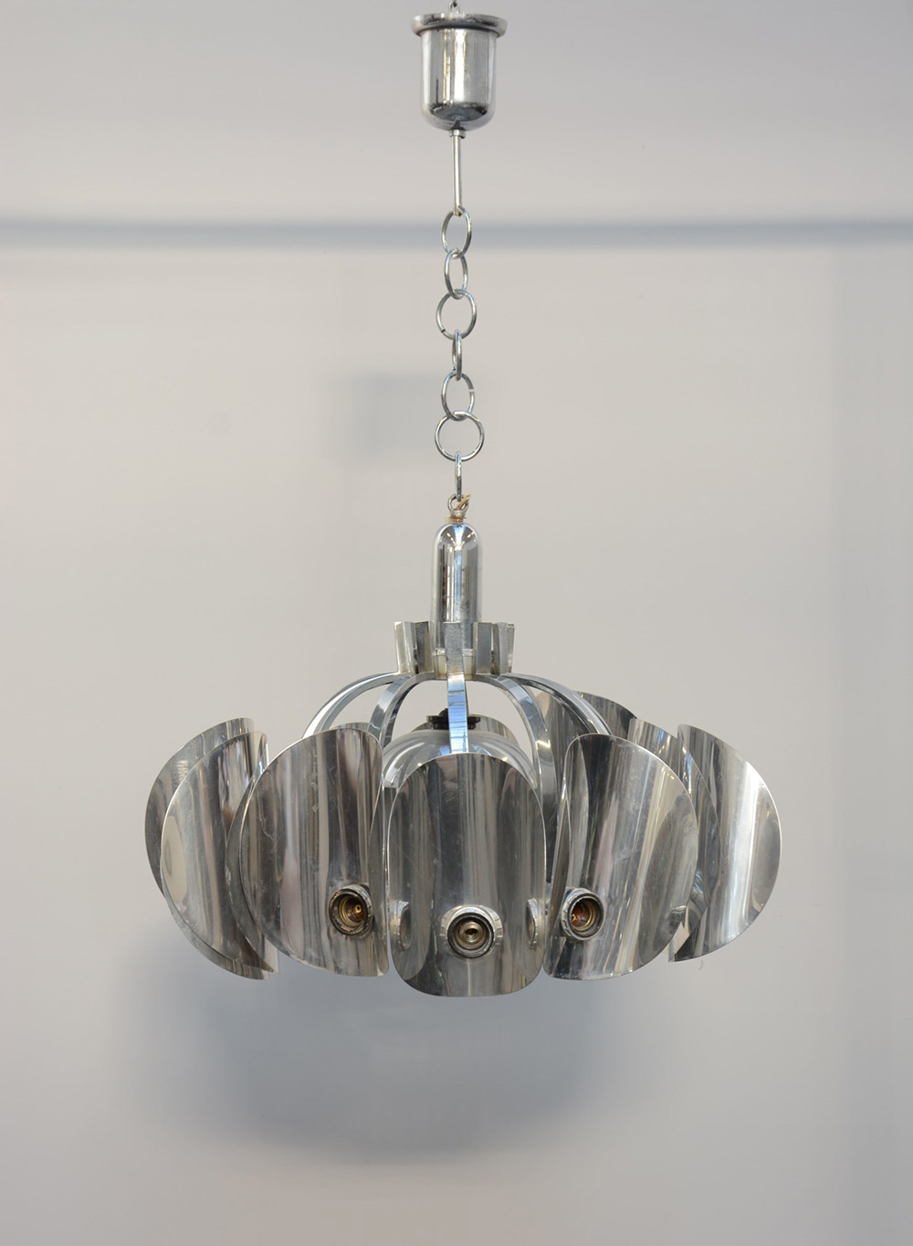 Lampadario a dodici luci con paralumi in lastra di acciaio inossidabile. Italia, anni 70 (h cm 96) (lievi difetti)