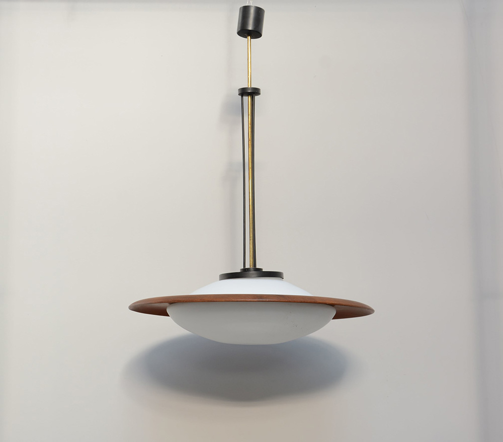 Goffredo Reggiani (attribuito) Lampada a sospensione in vetro lattimo satinato e disco in compensato di teak curvato. Produzione Reggiani, Italia anni 70 (h cm 80, d cm 60) (lievi difetti)