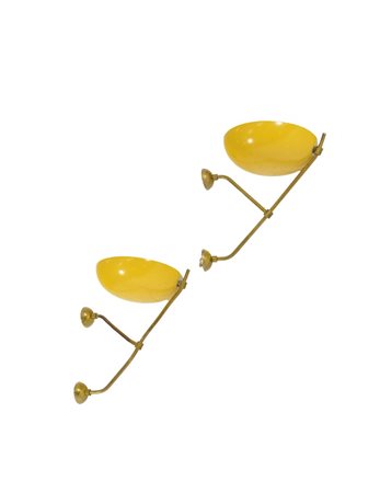 Coppia di appliques in ottone e paralumi in alluminio verniciato giallo. Produzione italiana, anni 40/50 (cm 40) (difetti)