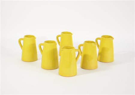 Lotto composto da sei brocchette in terracotta smaltata in giallo. Monogramma della manifattura alla base (h cm 13) (lievi difetti)