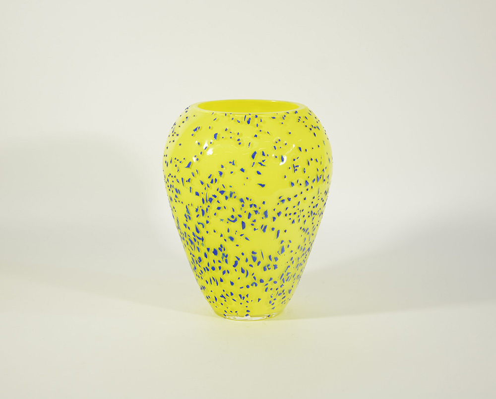 Barovier & Toso Vaso in vetro incamiciato giallo e incolore e a macchie a rilievo blu opaco. Firmato a punta sotto la base. Anni 70/80 (h cm 29)