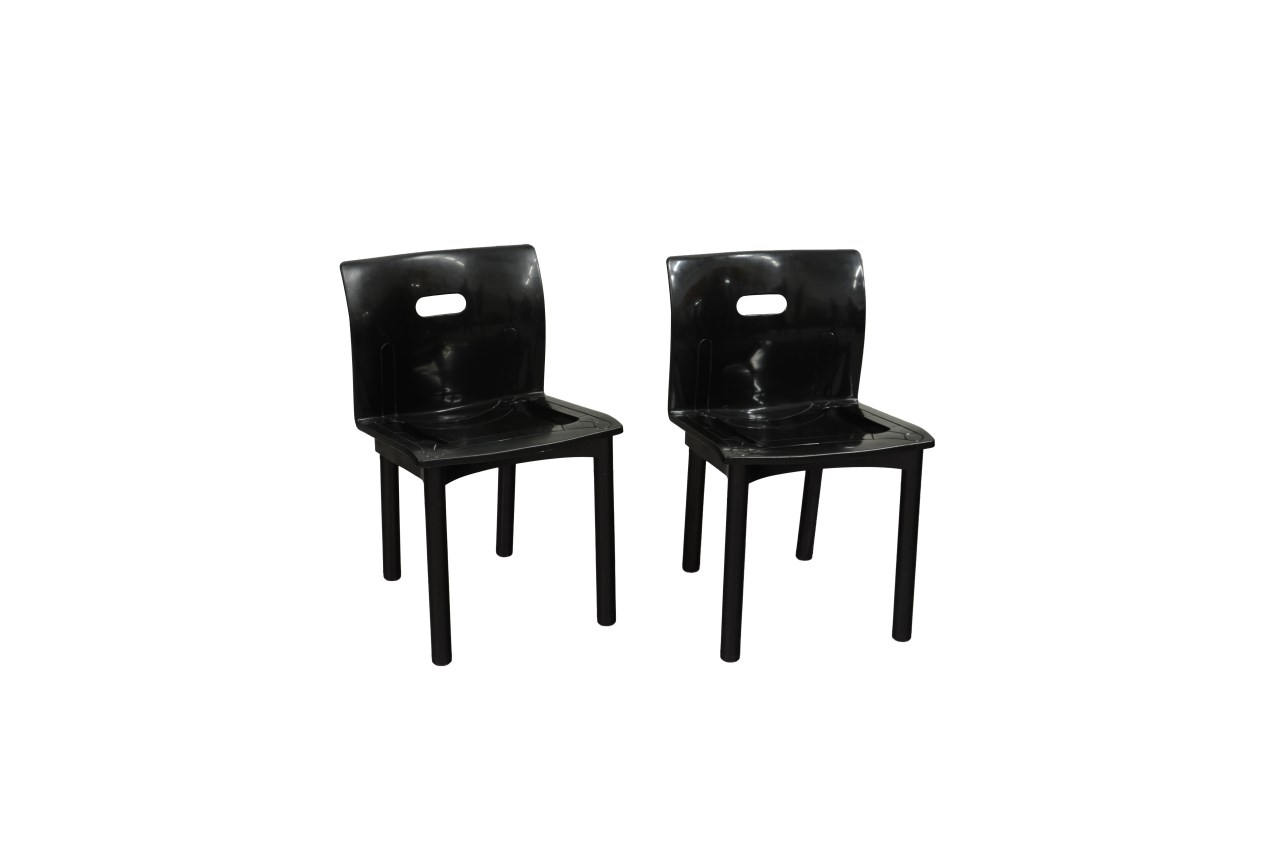 Anna Castelli Ferrieri (1918- 2006) Coppia di sedie impilabili modello "4870". Produzione Kartell, Milano 1985. Plastica nera. Premio compasso d'oro 1984 (cm 45x75x48) (lievi difetti) Bibliografia: G. Gramigna, Repertorio del design italiano 1950-2000 per l'arredamento domestico, Allemandi, Torino 2003, p. 346