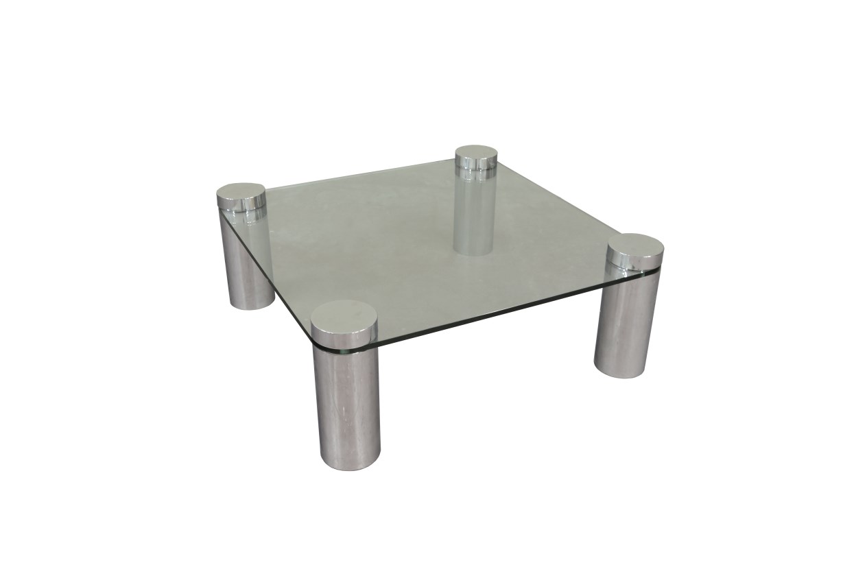 Tavolo basso con quattro bambe cilindriche in metallo cromato inox e piano in vetro molato di forte spessore. Italia, anni 70 (cm 100x40x100) (difetti)