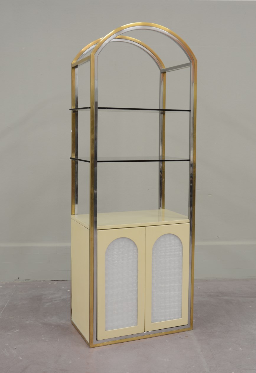 Alain Delon (attribuito) Mobile vetrina in profilato metallico cromato e di ottone, legno laccato color vaniglia, con due ante nella parte bassa e ripiani in vetro fumÈ nella parte alta. Italia anni 70 (cm 70x193x46) (lievi difetti)