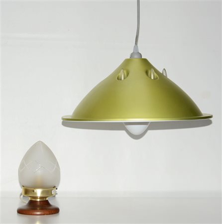 Lotto composto da una lampada a sospensione in plastica verde e una abat-jour in vetro e legno. Sec XX.