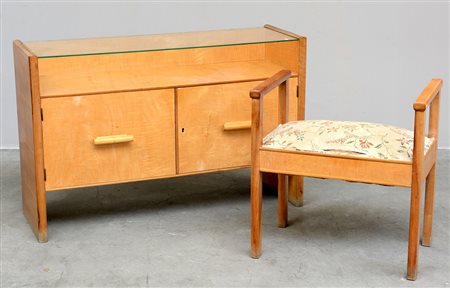 Pier Giulio Magistretti (attribuito) Mobiletto toilette in legno chiaro con piano in vetro e due ante, unito a uno sgabello analogo. Italia, fine anni 30 (cm 108x69x35) (difetti) Provenienza: Ca' del Fogher, Cortina. Progettata dall' Architetto Pier Giulio Magistretti.