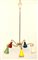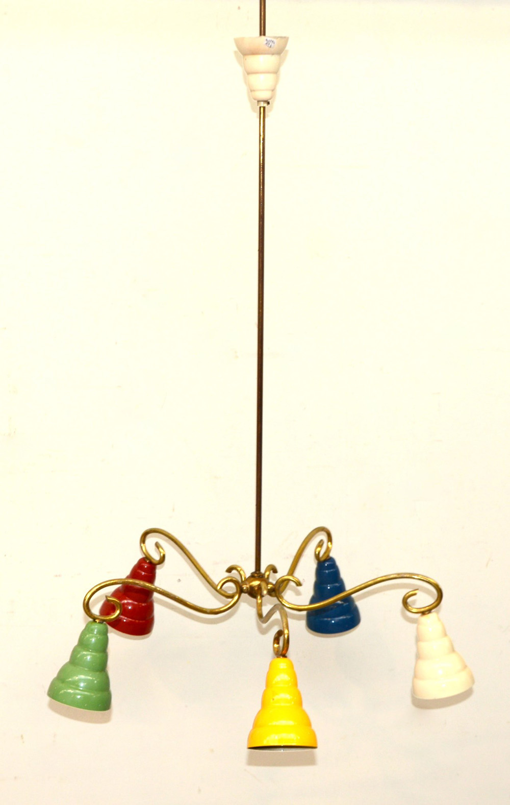 Lampadario a cinque fiamme in ottone con paralumi in alluminio laccato di diversi colori. Sec XX (h cm 115) (lievi difetti)