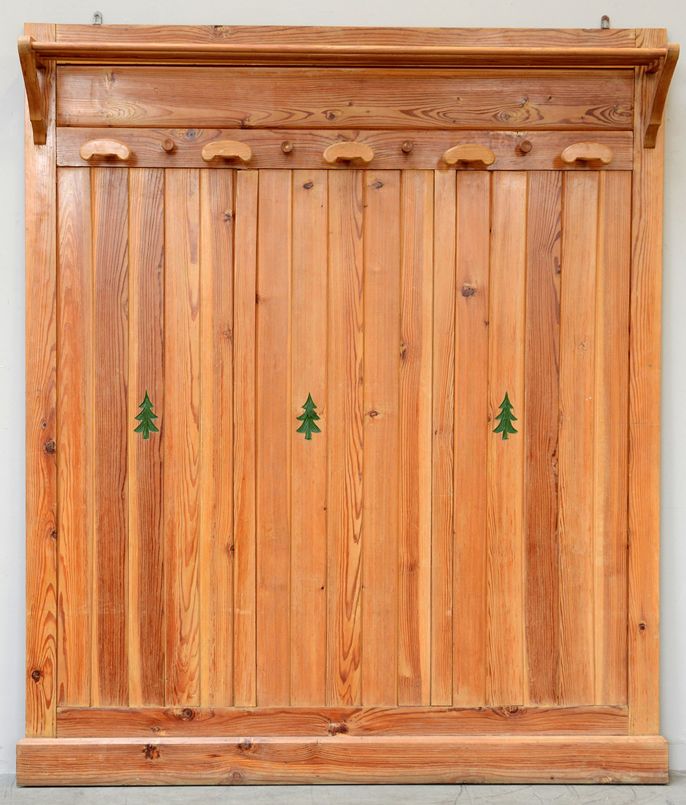 Pier Giulio Magistretti (attribuito) Appendiabiti in legno chiaro con decoro ad abeti incisi. Italia, anni 30(cm 160x191) (difetti) Provenienza: Ca' del Fogher, Cortina. Progettata dall' Architetto Pier Giulio Magistretti.
