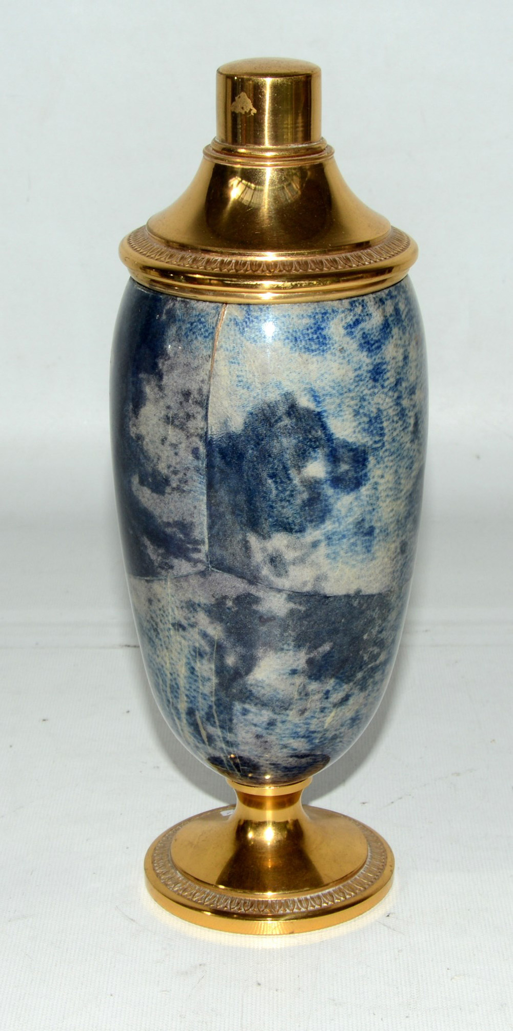 Manifattura Tura (attr.) Shaker con corpo rivestito in pergamena colorata e verniciata al poliestere blu, base e coperchio in metallo dorato. Anni 70 (h cm 25) (lievi difetti)