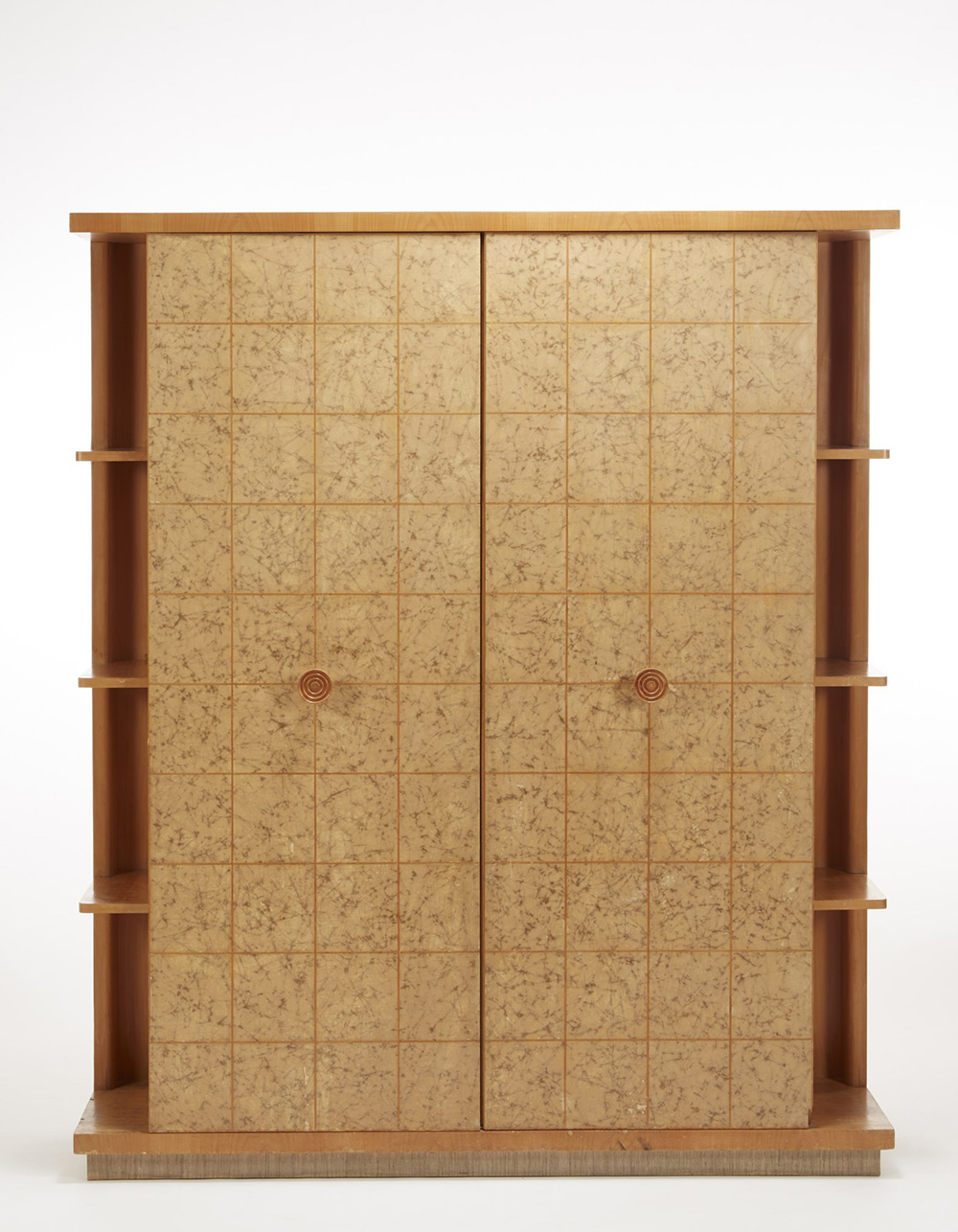 Pier Giulio Magistretti (attribuito) Armadio a due ante scorrevoli con fronte a campi quadrati in buxus marmorizzato e intarsiati a listelli. Quattro mensole su ogni fianco. Italia, anni 30 (cm 160x189x42) (difetti) Provenienza: Ca' del Fogher, Cortina d'Ampezzo, 1936, progettata dall'architetto Pier Giulio Magistretti