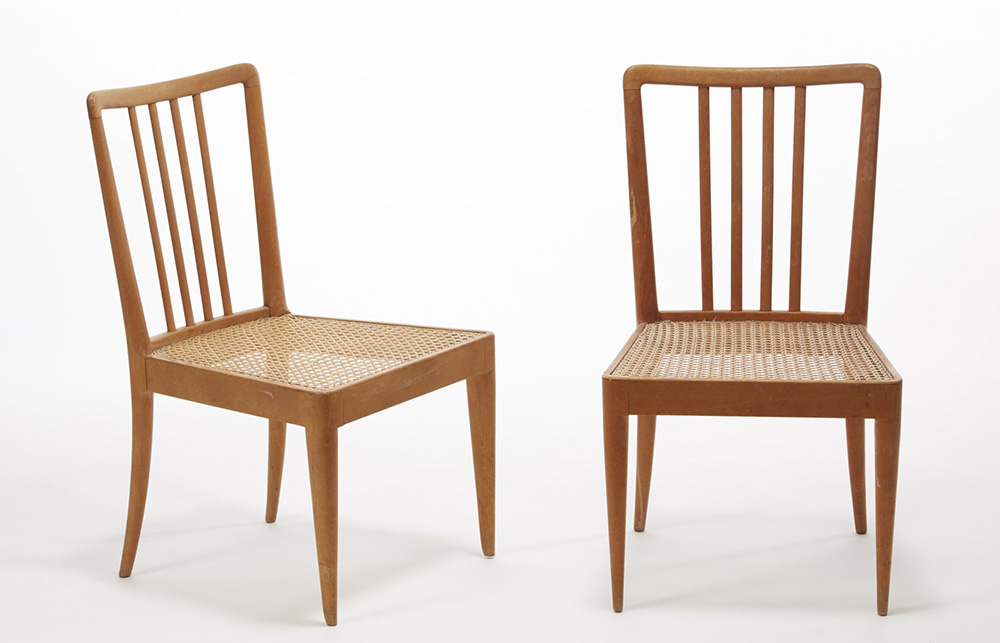 Pier Giulio Magistretti (attribuito) Coppia di sedie da camera in legno chiaro con gambe tornite e inflesse. Italia, fine anni 30 (cm 45x77x44) (difetti) Provenienza: Ca' del Fogher, Cortina d'Ampezzo, 1936, progettata dall'architetto Pier Giulio Magistretti