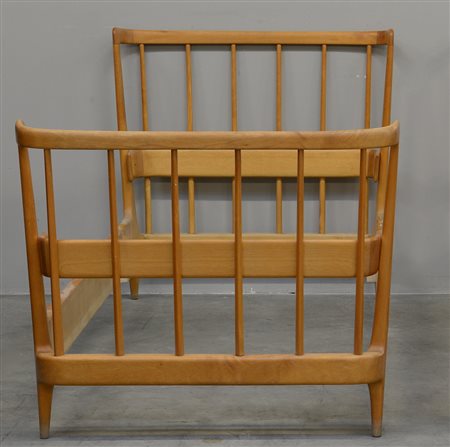 Pier Giulio Magistretti (attribuito) Letto singolo in legno chiaro con pediera e testiera a bacchette tornite verticali. Fine anni 30 (cm 167x92) (difetti) Provenienza: Ca' del Fogher, Cortina. Progettata dall' Architetto Pier Giulio Magistretti.