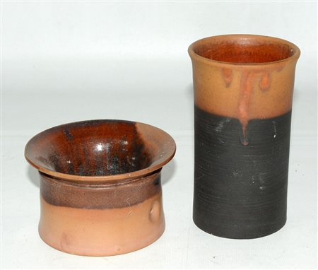 Fabbrini Lotto composto da una tazza e un bicchiere in ceramica smaltata nei toni del marrone e nero. Firmati alla base. Anni 60/70 (h cm 6 e 13) (lievi difetti)