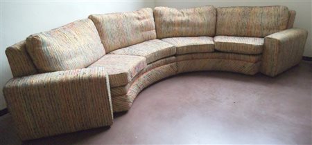 Divano a quattro posti a semicerchio, rivestito con stoffa policroma e...