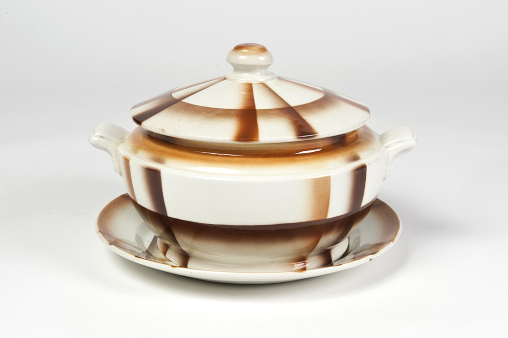 Lotto composto da una zuppiera con coperchio e un piatto aerografati nei colori giallo e marrone. Manifattura Ceramica Piemontese, anni 30 del sec XX