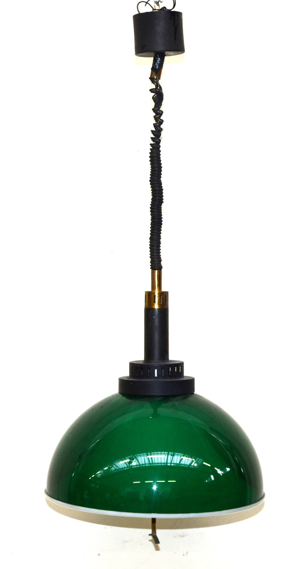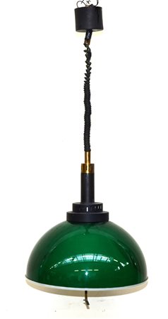 Lampada a saliscendi in metacrilato verde e bianco. Struttura in metallo laccato nero e ottone. Italia, fine anni 60 (difetti)