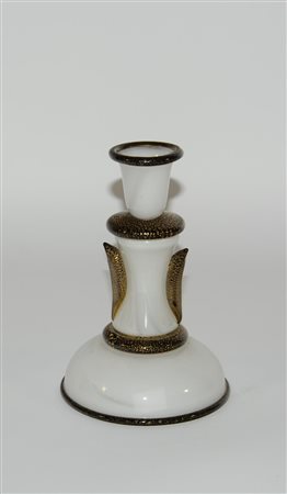 Barovier & Toso Candeliere in vetro lattimo con applicazioni in vetro ametista scuro. Produzione recente. Firma a punta sotto la base (h cm 19)