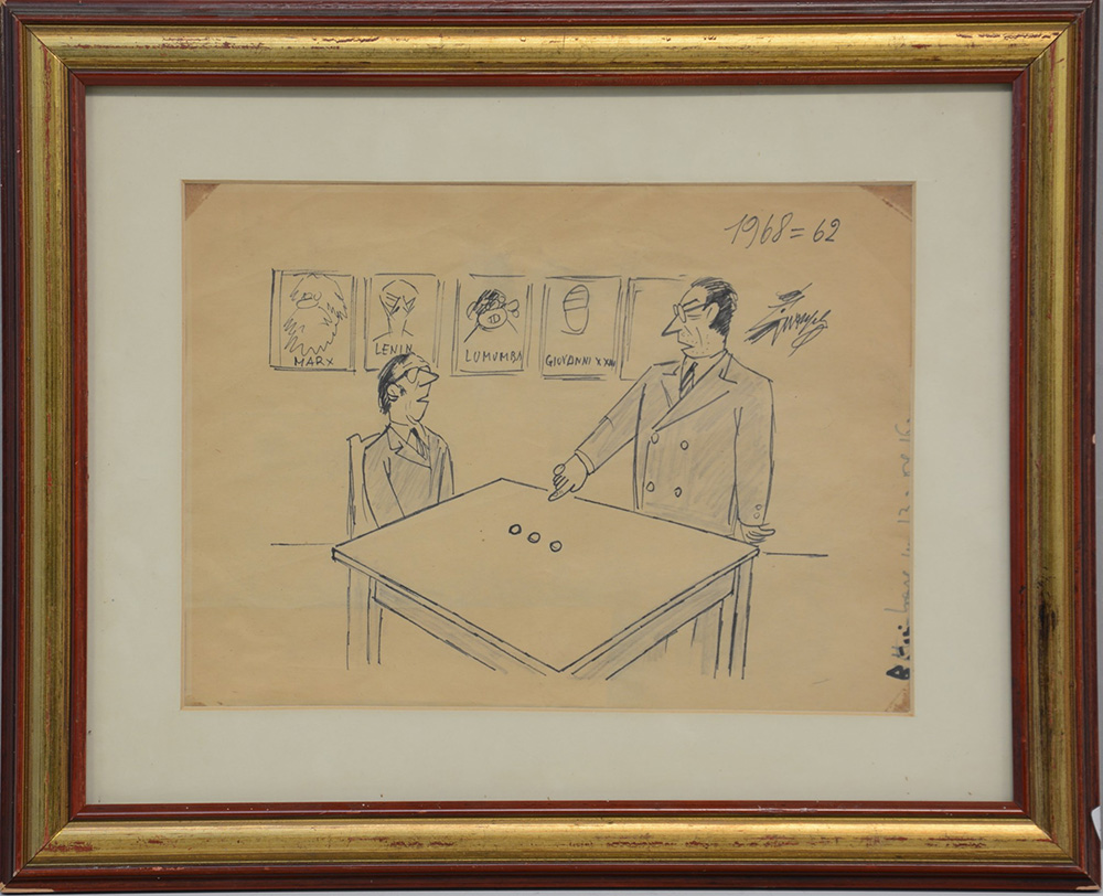 Firma indecifrata "Vignetta umoristica" Tecnica mista su carta (cm 20x28). Firmata in alto a destra. In cornice (difetti)