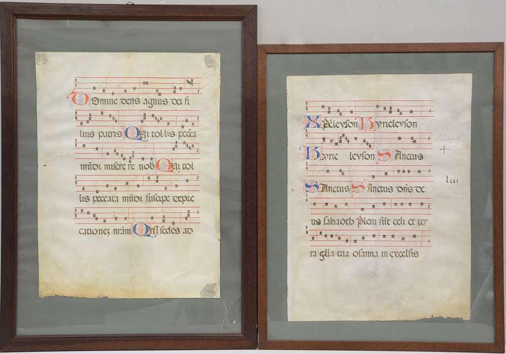 Coppia di antiche pagine di antifonari (cm 54x40) in cornici (difetti)