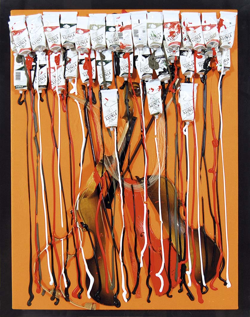 ARMAN FERNANDEZ Nizza 1921 - 2005 Violin On Orange Canvas With Pressed Paint Tubes 2002 violini tubetti e pittura su tela riportata su tavola Misure: 80x60 firma sul fondo autentica dell'Autore su foto Archivio Denyse Durand-Ruel nr. Arch. 7017 provenienza Studio Arman - etichetta al retro