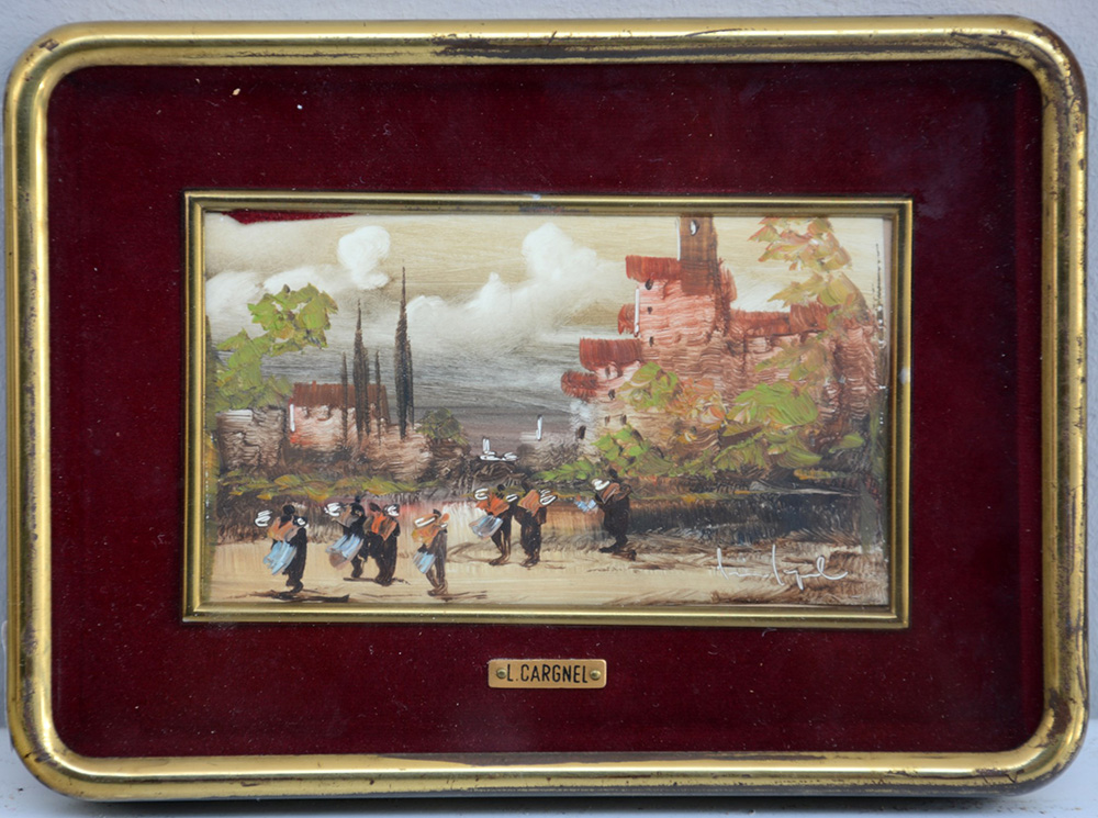 Lucio Cargnel Breganzio (1903- Milano 1998) "Paesaggio con case e figure" piccolo dipinto ad olio su avoriolina (cm 7x12) firmato in basso a destra, in cornice di metallo (difetti)