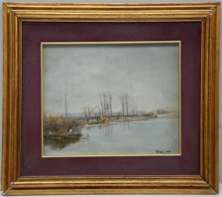 Firma incedifrata, "Paesaggio lacustre", olio su tavola (cm 20x24) firmato e datato 1929 in basso a destra, in cornice (lievi difetti)