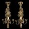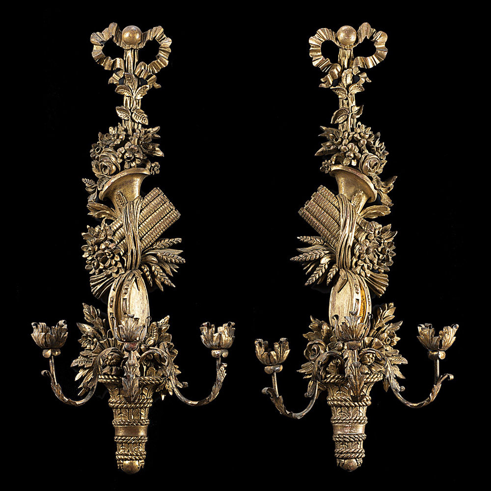 Coppia di fregi in legno intagliato e dorato a vasi fioriti, tamburi e fiocchi. Portalampade in metallo dorato (h. cm 90)