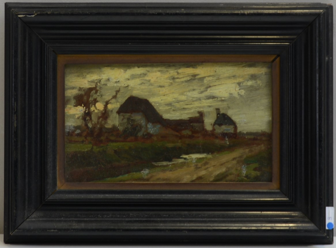 Francesco Sartorelli Cornuda (1856- Udine 1939) "Paesaggio con cascina" olio su tavoletta (cm 14.5x23.5) Firato in basso a destra. In cornice (difetti)