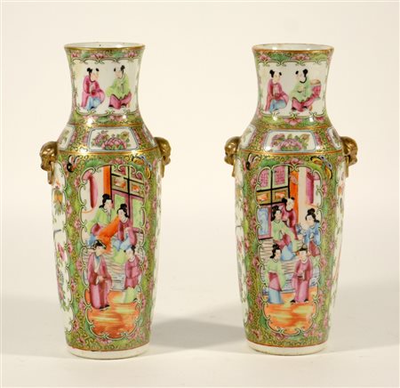Piccola coppia di vasi in porcellana Famiglia Rosa cantonese con decorazione di scene di vita quotidiana (h. 25 cm.)