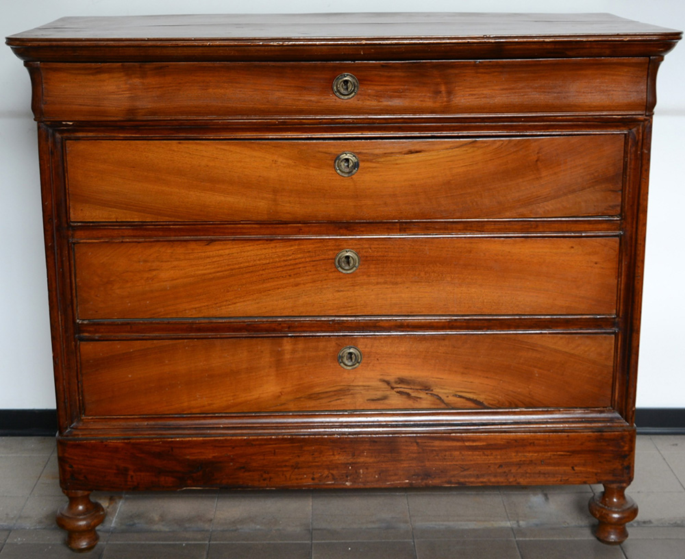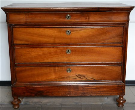 ComÚ lastronato in noce ad un cassetto sottopiano e tre grandi sul fronte. Piedi a cipolla. Fine sec. XIX (cm 118x97x56)(difetti)