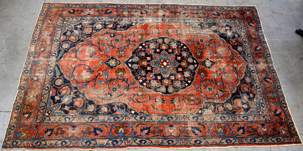 Tappeto Tabriz, Persia sec. XX. Disegno a medaglione blu su fondo mattone (cm 377x261) (gravi difetti)