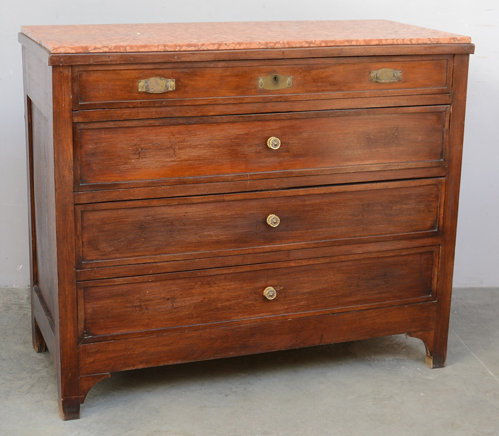 Canterano a quattro cassetti con ripiano in marmo rosso e piedi a mensola (cm 123x103x55) (difetti e mancanze)