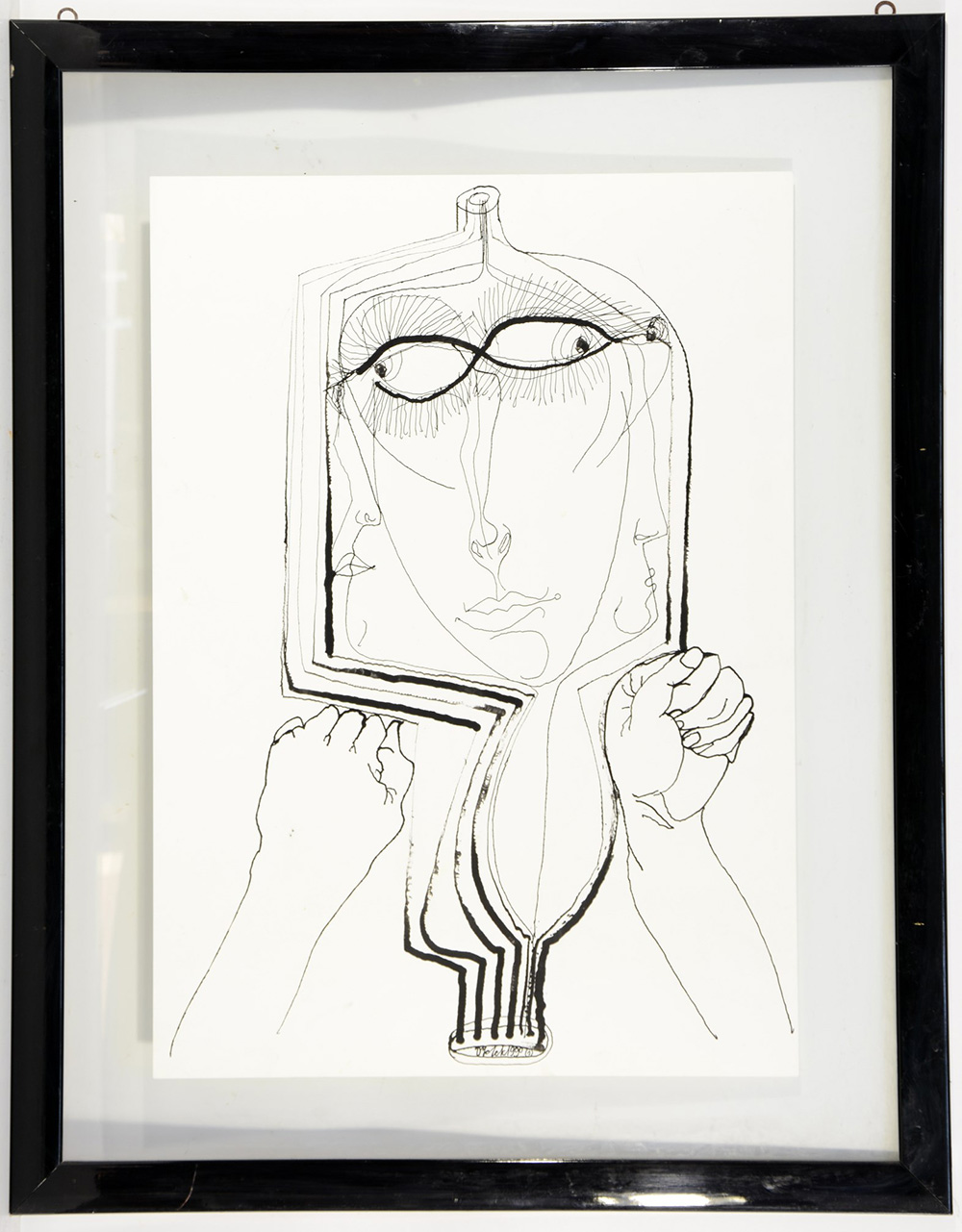 Firma indecifrata, "Composizione con figura", disegno a china su carta (cm 70x50), in cornice (lievi difetti)