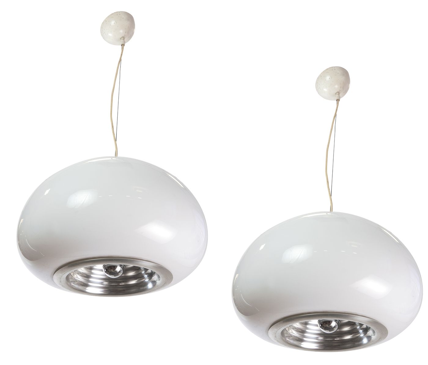 CASTIGLIONI ACHILLE E PIER GIACOMO - Blak and White, Due lampadari. Doppia illuminazione in vetro opalino bianco con coppa corrugata inferiore in alluminio. Deve il suo nome alla doppia illuminazione, concentrata o diffusa, che permette di modificare radicalmente l’atmosfera della stanza in cui è collocata. Prod. Flos 1965. cm 33 x50. Bibl.: Sergio Polano, Achille Castiglioni tutte le opere 1938-2000, Electa 2001, pag. 222.
