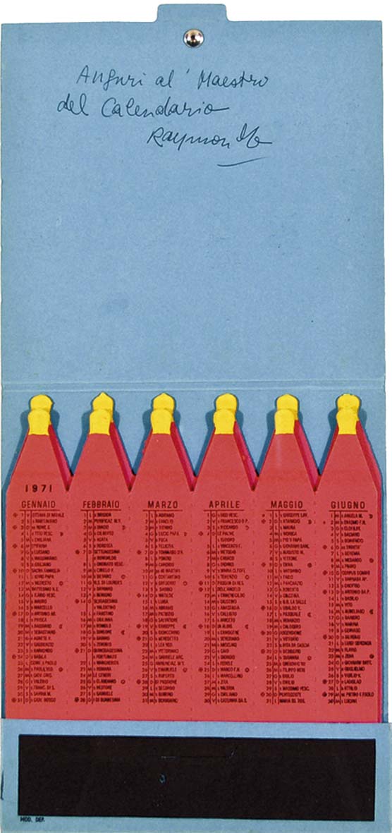 HAINS RAYMOND Saint Brieuc 1926 - 2005 Calendario 1971 fiammiferi tecnica mista e collage su calendario Misure: 47x21 firma e dedica a Raoul Schultz in alto data al retro Bibliografia Raoul Schultz mostra retrospettiva ai Mulini Portogruaro 2005 pag. 11
