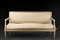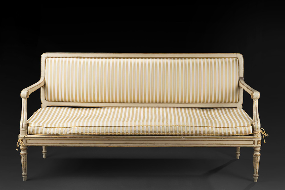 Divano in legno laccato e dorato con schienale e braccioli sagomati. Montanti e piedi sagomati e scanalati decorato con medaglioni floreali. Fine sec.XVIII (difetti)
