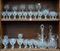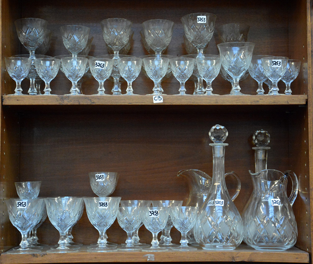 Servizio di bicchieri in cristallo sfaccettato, anni '60 circa, composto da dodici bicchieri per l'acqua, dieci per il vino rosso e dodici per vino bianco, undici per liquore e undici coppe, due bocche e due bottiglie con tappi (difetti)