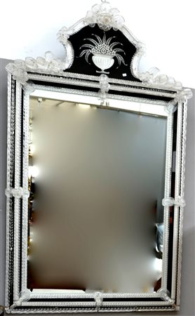 Specchiera in vetro di Murano decorata a motivi floreali, con cimasa incisa a vaso di fiori (cm 131x78) (difetti e mancanze)