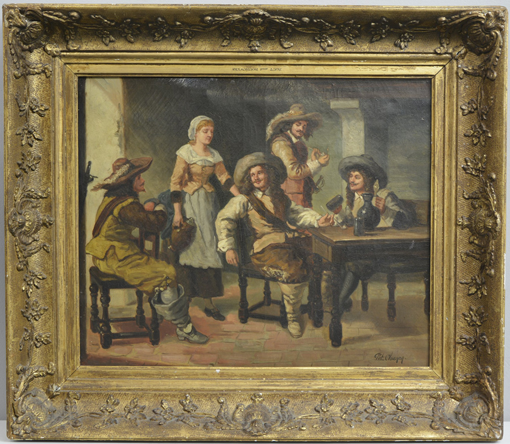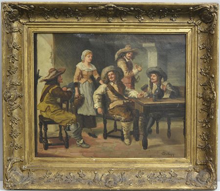 Firma indecifrata sec.XIX "Scena d'osteria", olio su tela (cm 46x53) In cornice dorata