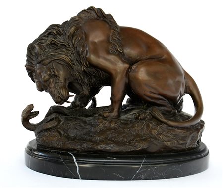 Scultura in bronzo raffigurante "Leone e serpente" su basamento in marmo, firmato alla base A. Barye (lievi difetti)