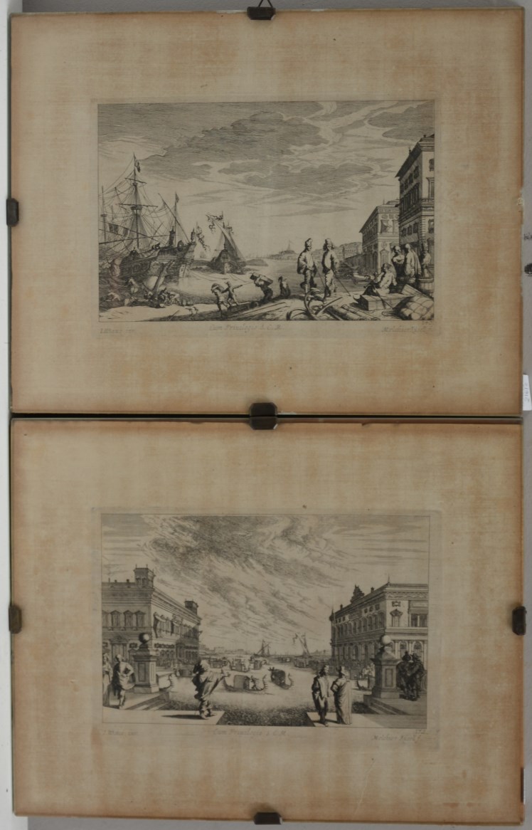 Melchiorre Kussel "ìScorci veneziani" coppia di acqueforti (cm 25x32) In cornici (difetti)