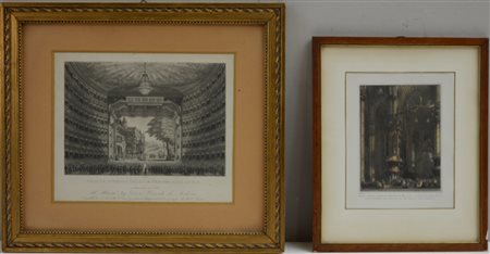 Lotto composto da un'incisione raffigurante interno del teatro della Scala e una a colori raffigurante interno del Duomo